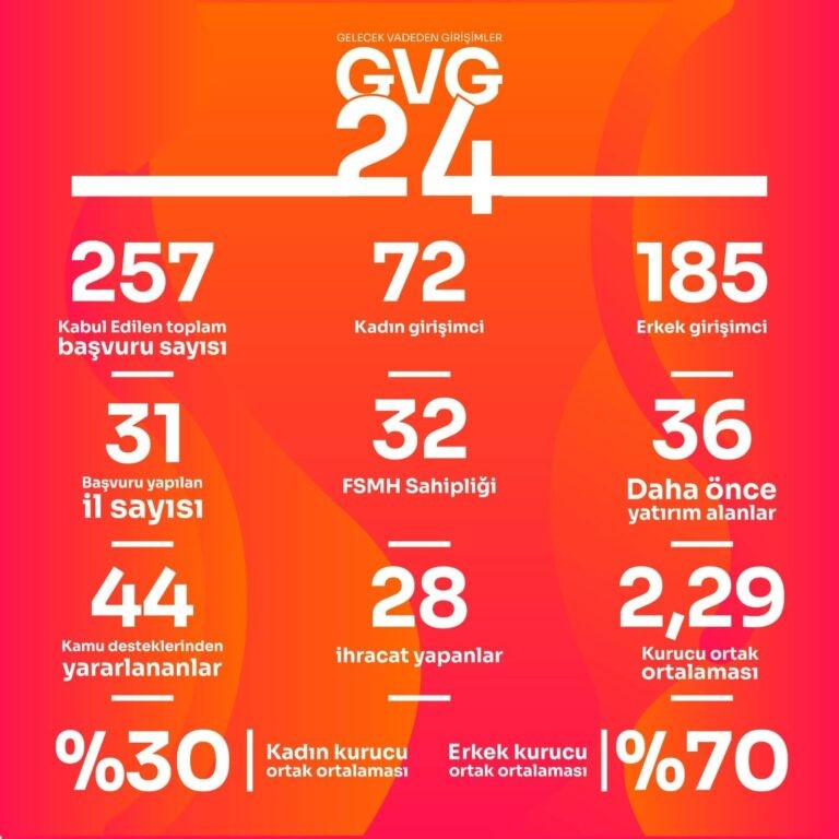 Gelen başvurular içerisinden yarışma kriterlerine uygun 257 girişimin başvurusu kabul edildi. Bu başvuruları yapan girişimcilerinin 72’si kadın girişimci 185 tanesi de erkek girişimci. Yarışmaya Bursa’dan Konya’ya, Eskişehir’den Diyarbakır’a kadar toplamda 31 ilden başvuru gelirken başvuruların en fazla geldiği il İstanbul oldu. Başvuru yapan girişimlerin 32 tanesinin marka, faydalı model ve patent sahipliği gibi fikri ve sınai mülkiyet hakkı sahipliği bulunuyor. Girişimlerin 36 tanesi yatırım almış girişimlerken 44 tanesi de daha önce KOSGEB, TÜBİTAK gibi kamu desteklerinden yararlanmış durumda. Başvuru yapan girişimlerin 28 tanesi ihracat yapmayı başarmış. Yarışmaya başvuran girişimlerin büyük çoğunluğu birden fazla kurucu ortakla kurulmuş durumda. Girişim başına düşen kurucu ortak sayısı 2,29 olurken bu kurucu ortakların %30 kadın kurucu iken %70’i erkek kurucudan oluşuyor. Başvuru yapan girişimler faaliyet alanlarına göre incelendiğinde en fazla başvuru bilişim teknolojileri , sağlık, sürdürülebilirlik ve e-ticaret alanlarından geldi.